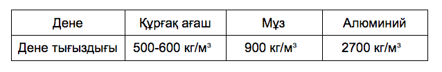 Ауырлық күші 50000 H, тығыздығы 1000 кг/м³ дененің көлемі (g = 10 м/с²)