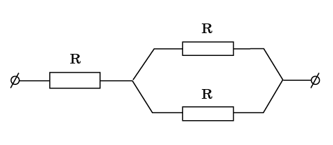 Кедергілері өзара тең үш бірдей резистор суретте көрсетілгендей жалғанған. Бір резистордың кедергісі R=6 Ом. Тізбек бөлігінің толық кедергісін анықтаңыз.