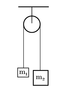 Суретте көрсетілген денелер жүйесі қандай үдеумен қозғалатынын анықтаңыз. Бірінші дененің массасы екінші дененің массасынан екі есе аз. \((g=10 \ м/с^2)\)