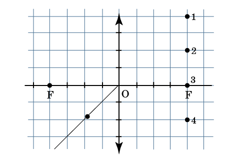 Суретте жұқа линзаға түсетін жарық сәулесі көрсетілген. Жарық сәулесі линзада сынған соң номермен белгіленген қайсы нүктеден өтеді?