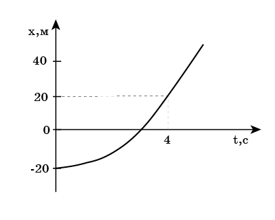 Суретте Ox осі бойымен теңүдемелі қозғалған материялық нүктенің координатасының уақытқа тәуелділік графигі көрсетілген. Уақыттың алғашқы мезетінде \(t_₀=0\) дене жылдамдығының Ox осіндегі проекциясын 6 м/с-ке тең деп есептеп, дене үдеуінің Ох осіндегі проекциясын анықтаңыз.