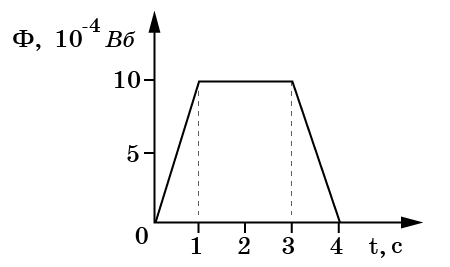 Суретте шарғыны тесіп өтетін магнит ағыны өзгерісінің уақытқа тәуелділігі көрсетілген. \([0\,-1]\) с уақыт интервалындағы индукцияның ЭҚК-ін анықтаңыз.