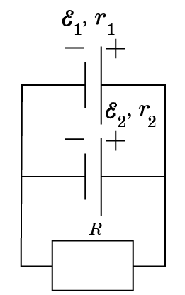 ЭҚК-сы \(ε_1 = 6\) В және \(ε_2 = 4\) В және ішкі кедергісі \(r_1 = 0,5\) Ом және \(r_2 = 1\) Ом болатын екі батарея көрсетілгендей кедергісі R = 8,5 Ом резистормен тізбектей жалғанған. Резистор арқылы өтетін ток күшін анықтаңдар.
