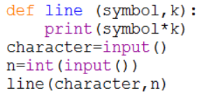 Манас n бірдей символдардың жолын экранға шығаратын программа құрды. Яғни, қандай да бір символдың n-ге енгізілген мәніне байланысты жол шығады. Мысалы, символ ретінде .py және n –ге 5 мәні енгізілсе, экранда .py.py.py.py.py жолы пайда болады. Манастың бірдей символдардың жолын шығаратын программасын талдап, сұрақтарға жауап беріңіз.