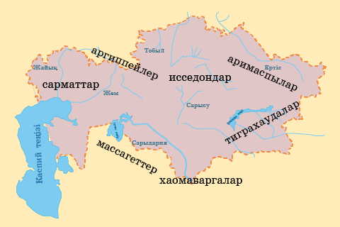 Көрсетілген карта бойынша аримаспы мен аргиппейлер арасында мекендеген тайпаны көрсетіңіз: