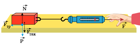Однажды Айбек решил проверить закон Кулона – Амонтона в действии. Он взял сосновый брусок, массой 0,6 кг с размером 20×10×5 см, прикрепил нить к нему и начал двигать равномерно и прямолинейно с помощью пружинного динамометра (см.рис).