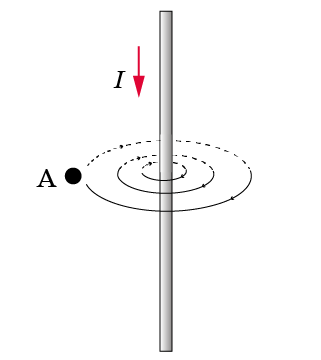 На рисунке изображено магнитное поле проводника с током. Куда направлены силовые линии магнитного поля в точке А?