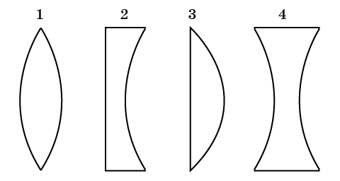 Какие из стеклянных линз, изображенных на рисунке, не дают действительных изображений предметов в воздухе?