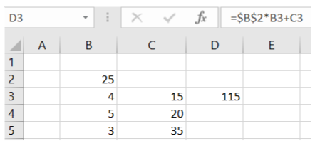 В ячейку D1 введена формула =А1*3+ $C$1 /2.